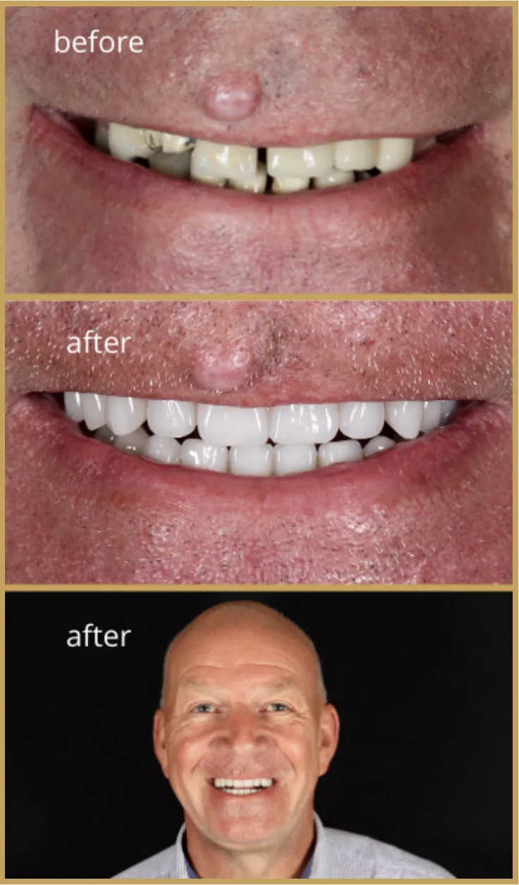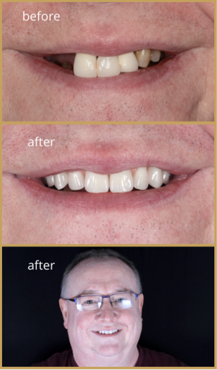 "I have just completed 8 months of work with Stephen and staff and can highly recommend them. My teeth were in a poor state due to missing teeth and jaw section from sports in the past. I had a bone graft and implants done in stages. I now have a full smile for the first time in 30 years and am very happy with it." {Jay Calvert}